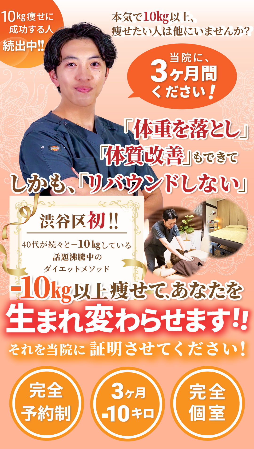 職場の同僚はたくさん食べてても、細い人もいるのに自分は食事制限してるし、運動もしてる。なのに全然体重が減らない、これはもう体質のせいだ…と諦めていたところ、たまたまasmotさんを発見。鍼は初めてだったので、すこし緊張していましたが、先生の誠実さと丁寧な説明、鍼をする時には刺激量なども確認しながら施術してくださるので安心。今では痛いというよりも心地よくて毎回楽しみになってます。asmotさんへ通いー10.2キロ減量を達成しました。悩みだった体型も、同僚からも、「後ろ姿だと一瞬誰か分からない」と言ってもらえるように!